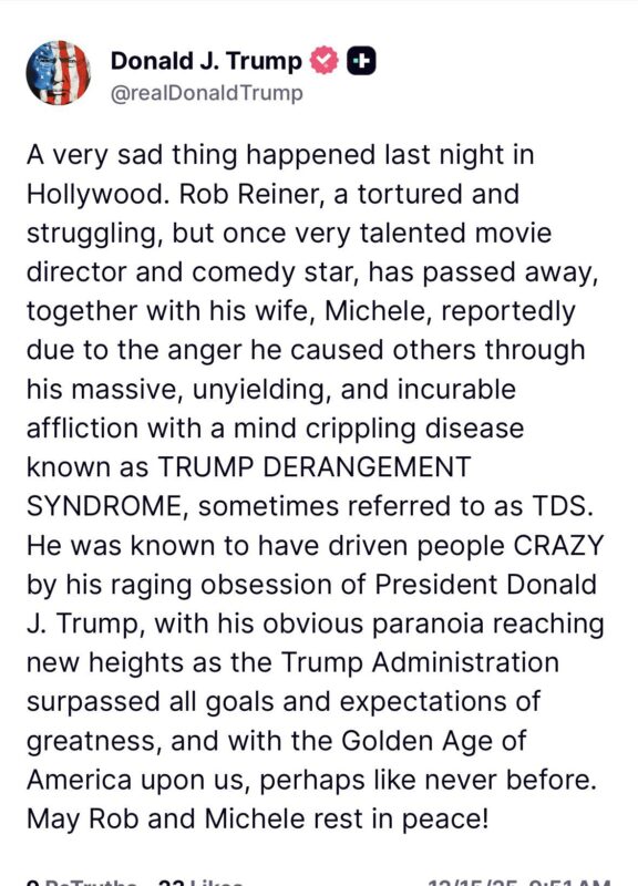 12.17 Mediabistro: “Reiner was one of the last of his kind – a guy whose work not only filled seats (at least for a good couple of decades) but also actually shaped how a lot of us understand storytelling, character development, and comedic timing. Reiner’s films feel like a relic – they assume that the audience is as smart as the characters on the screen, and every bit as invested (without a lot of heavy-handed exposition or pandering voiceovers). His works trusted the power of tone, and believed that the characters and the worlds they inhabit matter more than some studio algorithm. . . .Reiner taught us that accessibility and sensibility weren’t enemies, and that the best written characters in film offer the kind of insight and understanding into human nature (and the state of the world) that no other medium can replicate. . . .Reiner’s work is worth thinking about this week, if only because one quick glance at the media business headlines this week seem to be trending in the exact opposite direction. You want the truth? You can’t handle the truth. Because the truth is, these stories from the last week suggest that the entertainment industry is moving in a direction that’s got a lot to do with industry, and precious little to do with entertainment.”