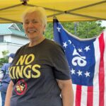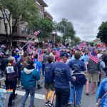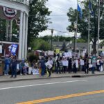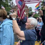 noon parade in Saratoga Springs, where thousands of people under the Indivisible ADK/Saratoga banner, along with a coalition of pro-democracy allies, marched down Broadway in Saratoga Springs as part of the Saratoga-Wilton Elks Lodge Annual Flag Day Parade. We were by far the largest group. It was exhilarating–marching, chanting, receiving the encouragement of the spectators standing outside the shops and restaurants. Afterwards, we headed north to Warrensburg, where Ginny ran the medical tent at a second rally, where another 800 attended.